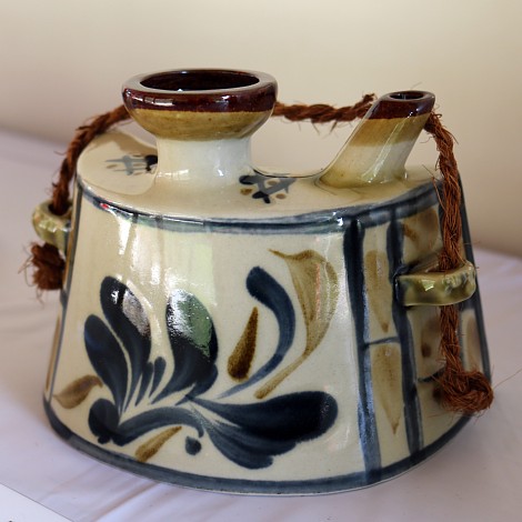 腰に付けやすいように胴の横断面が三日月形(腰に当たる部分が曲線)になっている、泡盛を携帯するための酒器です。